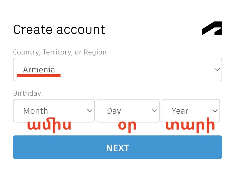 Բացվող էջում դուք պետք է ընտրեք Countrry – Armenia (երկիր – Հայաստան) և նշեք ձեր ծննդյան ամիսը, օրը և տարին (Birthday)։ Եթե չգիտեք ամիսները անգլերենով, ապա աջ կողմում գտնվող աղյուսակում կան թարգմանություններ, որոնք դուք պետք է անգիր սովորեք: Վերջում սեղմեք NEXT (hաջորդ) կոճակը: