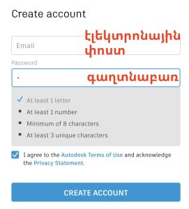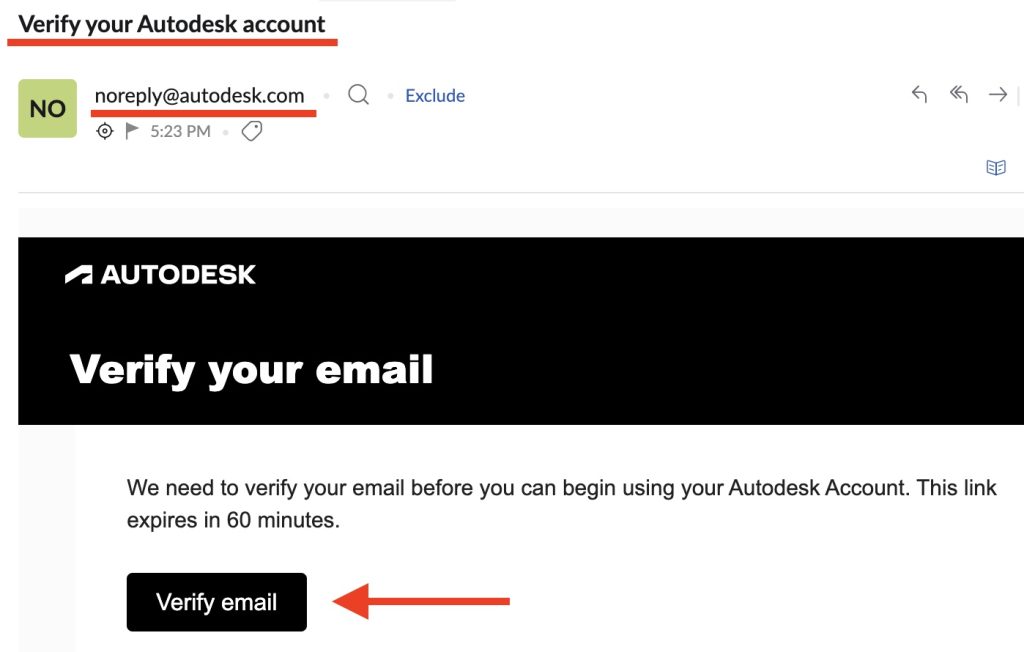 Միաժամանակ noreply@autodesk.com հասցեից նամակ կուղարկվի նախկինում նշված էլ.փոստի վրա: Այս նամակի թեման կլինի Verify your Autodesk account (հաստատեք ձեր աքաունթը)։ Նամակը պարունակում է կոճակ Verify email՝ որը պետք է սեղմել: