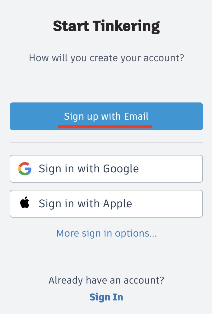 Սեղմեք Create personal account (Ստեղծել անձնական աքաունթ) որպեսզի անցնեք հաջորդ հարցին. Եթե ​​ունեք Google, Apple, Facebook կամ Microsoft հաշիվ, ապա կարող եք ընտրել գրանցման ավելի հեշտ եղանակ՝ սեղմելով համապատասխան կոճակը: Հաջորդը, մի փոքր ավելի բարդ գործընթացով, կնկարագրվի էլեկտրոնային փոստի ցուցումով: Սեղմեք Sign up with Email (Գրանցվել էլ.փոստով):