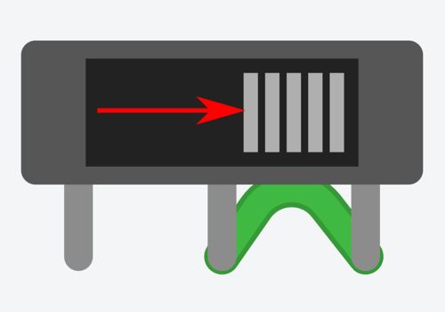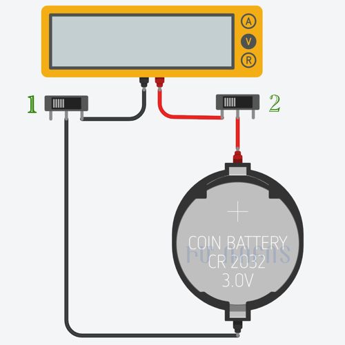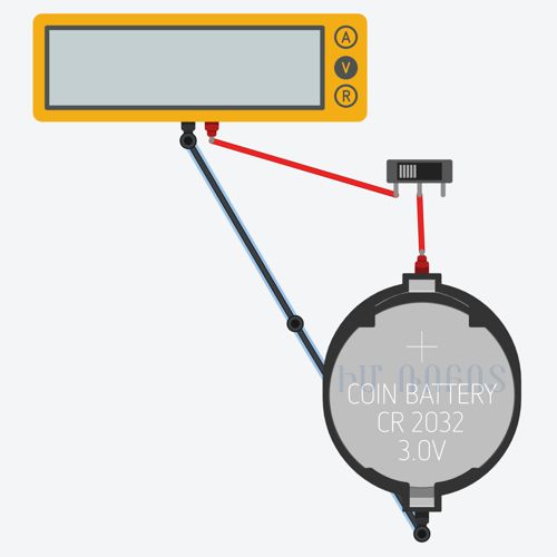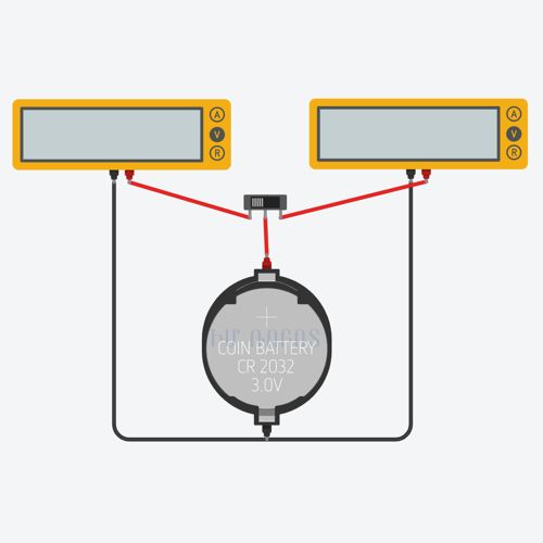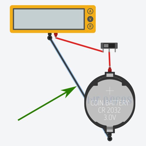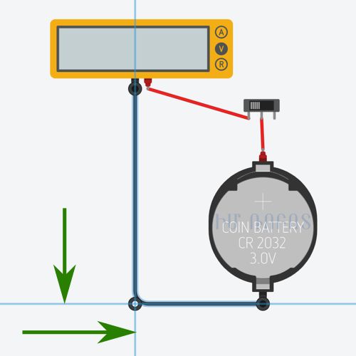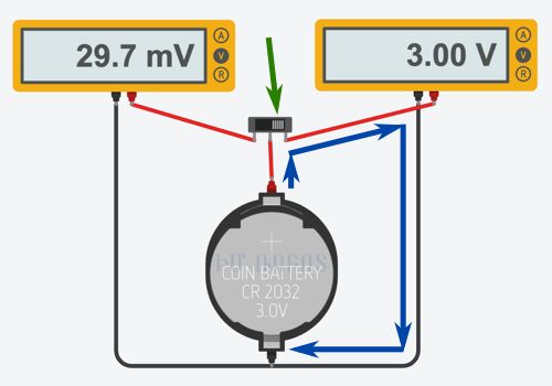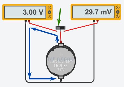 Այս Նկարներին կապույտ սլաքները ցույց են տալիս հոսանքի հիմնական ուղղությունը: Կախված անջատիչի սահիկի դիրքից, աջ կամ ձախ մուլտիմետրի վրա ցուցադրվում է 3 վոլտ լարում, որն հավասար է մարտկոցի լարումին: